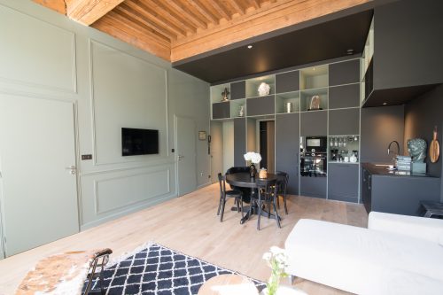 Dès le debut du chantier, un magnifique plafond à la française a été découvert dans le T3, ce qui a guidé la conception de la suite du projet. Elément majeur, il a été mis en valeur par un aménagement sobre mais finement travaillé, tout en verticalité. Une attention particulière a été portée au mobilier et notamment à celui du mur séparateur de la chambre principale et du séjour, qui se transforme en réel «mur habité», accueillant des rangements et une partie de la cuisine.